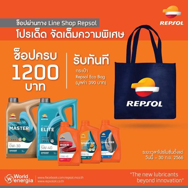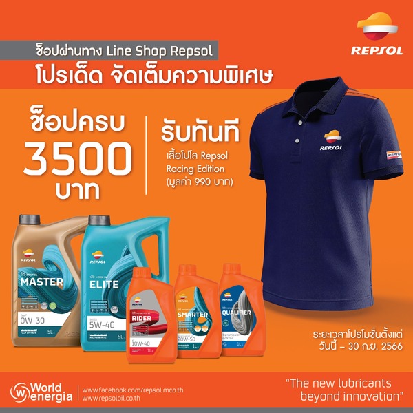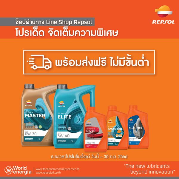 น้ำมันหล่อลื่น Repsol จัดเต็มโปรเด็ดเพื่อพลังเครื่องยนต์พันธุ์แกร่ง ต้อนรับเดือนกันยายนแบบแจกหนัก แจกจริง เพียงสั่งซื้อผลิตภัณฑ์ทั้งสำหรับรถยนต์หรือรถจักรยานยนต์ผ่านทาง Line Shop : REPSOL Thailand ครบตามกำหนด รับทันทีของพรีเมียมลิขสิทธิ์แท้จาก Repsol