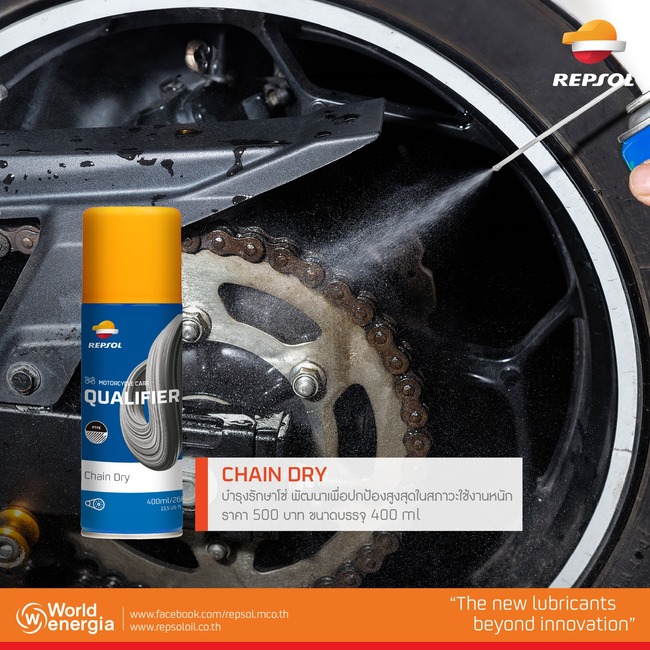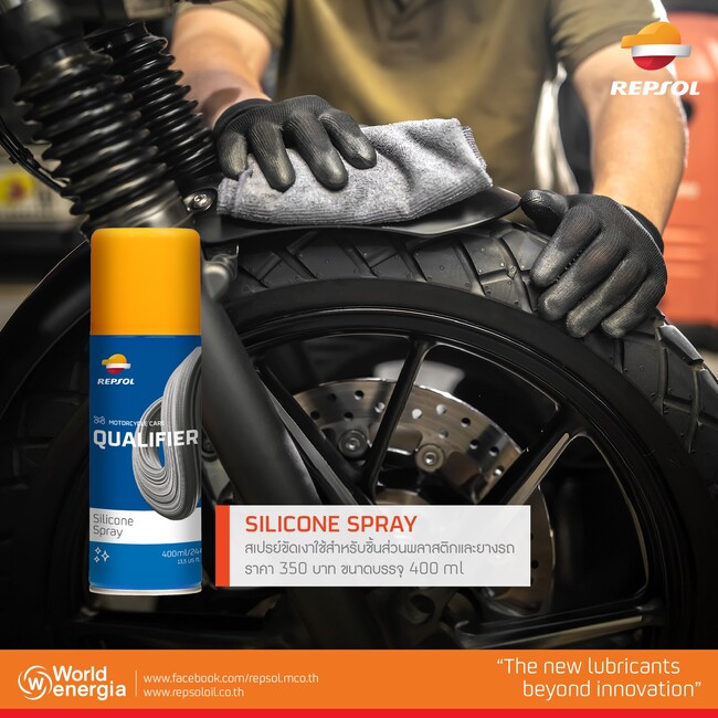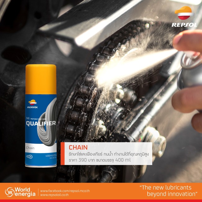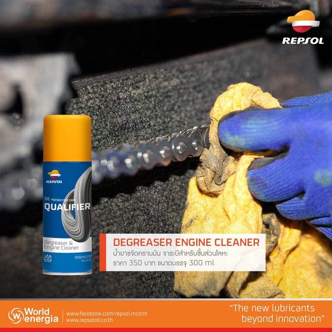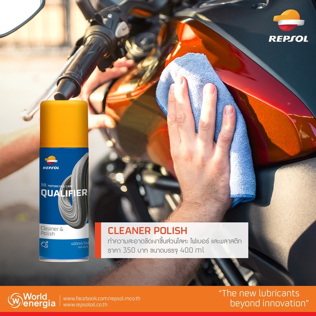 Repsol จึงพัฒนา QUALIFIER Cleaner and Polish ผลิตภัณฑ์ดูแลทำความสะอาดที่มีคุณภาพดี มีมาตรฐาน ทั้ง 6 ตัว ใช้สำหรับดูแลชิ้นส่วนจักรยานยนต์เพื่อความสวยงามและสมรรถนะที่ดี!!